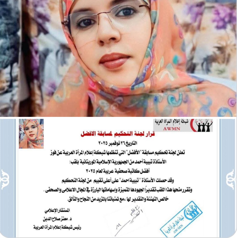 أعلنت لجنة التحكيم التابعة لمسابقة “الأفضل” التي تنظمها شبكة إعلام المرأة العربية، اليوم الأربعاء 26 نوفمبر 2025، فوز الأستاذة تبيبة أحمد من الجمهورية الإسلامية الموريتانية بلقب أفضل كاتبة صحفية عربية لعام 2025.
