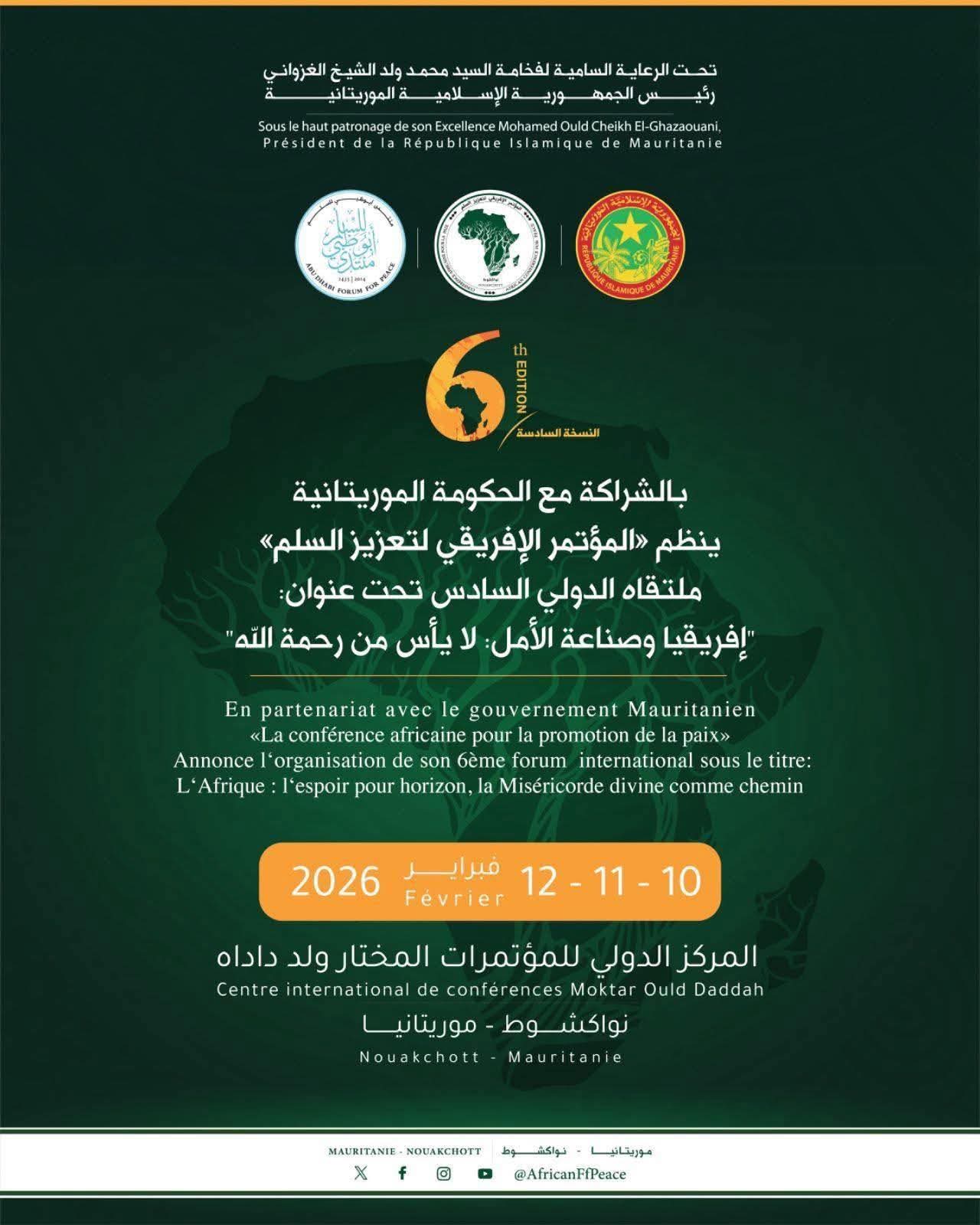 أعلن المؤتمر الإفريقي لتعزيز السلم/Conférence Africaine pour la Paix اليوم في العاصمة الموريتانية نواكشوط عن عقد ملتقاه الدولي السادس، تحت الرعاية السامية لفخامة رئيس الجمهورية الإسلامية الموريتانية، السيد محمد ولد الشيخ الغزواني، وبالرئاسة العلمية لمعالي الشيخ العلامة عبد الله بن بيه، رئيس منتدى أبوظبي للسلم، بالتعاون بين حكومة الجمهورية الإسلامية الموريتانية ومنتدى أبوظبي للسلم، وذلك بقصر المؤتمرات – المرابطون، في العاصمة نواكشوط، خلال الفترة من 10 إلى 12 فبراير 2026.