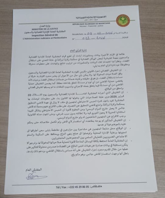 طالعنا في الإيام الأخيرة بيانات ومنشورات أرادت أن تضع قيام المفتشية العامة للإدارة القضائية والسجون بمهمة تفتيشية لبعض الهياكل القضائية في محكمة ولاية لبراكنة في خانة التعدي على استقلال القضاء. ونظراً لما اعتمدته تلك البيانات والمنشورات من ترتيب نتائج واتهامات على معطيات محرفة ومغلوطة، نود إنارة الرأي العام بما يلي: