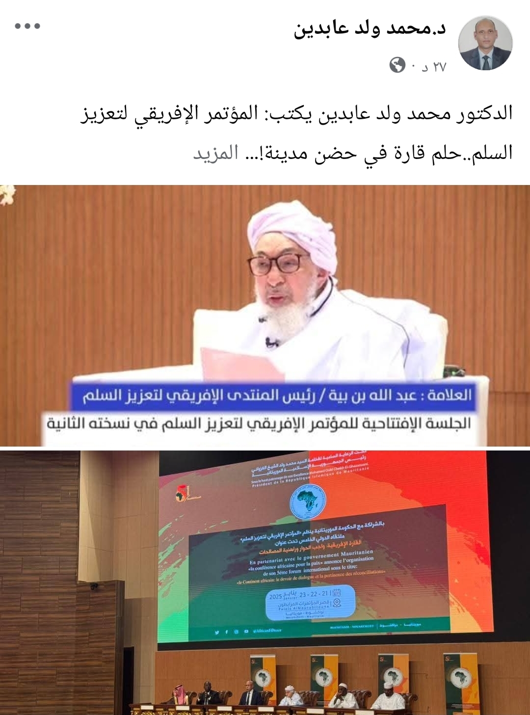حفظ الله الإمام العلامة المجتهد المجدد الشيخ عبد الله ولد بيه، وأطال بقاءه ذخرا وفخرا للسفارة العلمية الشنقيطية في مشارق الأرض ومغاربها، فهو حبر الأمة الإسلامية، والإمام المعاصر لمسيرتها التجديدية، وهي دائما فى حاجة ماسة وضرورة حاقة إلى قبس من نور علمه الغزير، وضياء فكره المستنير، لتذكر الغافل وتدفع الصائل، وتصون القيم وتحفظ الأمم.